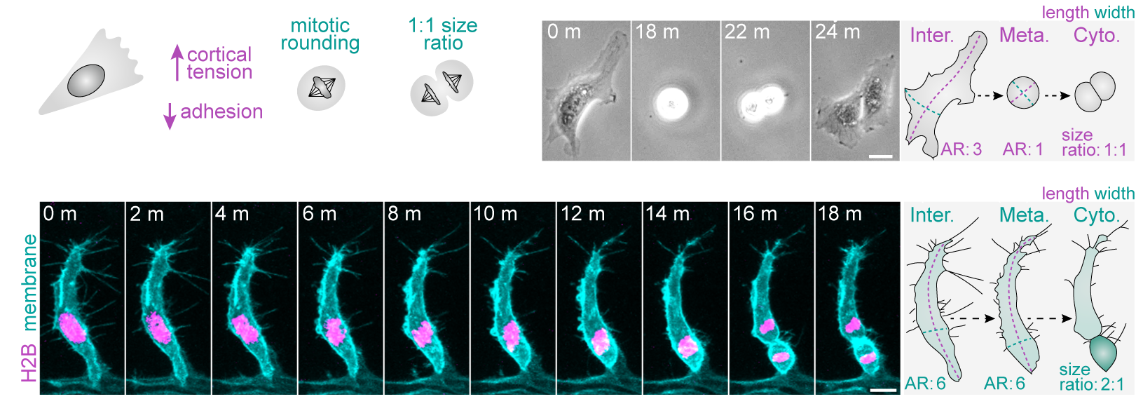 More recently, we demonstrated that a fundamental trigger for these asymmetric divisions is the shape of cells in interphase (Lovegrove et. al., 2025. Science). Most cells are thought to adopt a spherical geometry in division, a process termed mitotic rounding (Fig.2a). Indeed, endothelial cells in 2D culture exhibit classic mitotic rounding (Fig.2b). In contrast, we find that endothelial cells and other cell types in vivo can switch to a novel “isomorphic” mode of division, which uniquely preserves pre-mitotic morphology throughout mitosis (Fig.2c). We further identify that distinct shifts in interphase morphology act as conserved instructive cues triggering this switch to isomorphic division. Moreover, in isomorphic divisions, we find that maintenance of interphase cell morphology throughout mitosis ultimately enables cell shape to act as a geometric code defining mitotic symmetry, identity determinant partitioning, and daughter state (Fig.3). Thus, morphogenetic shape change both sculpts tissue form and generates the cellular heterogeneity driving tissue assembly.