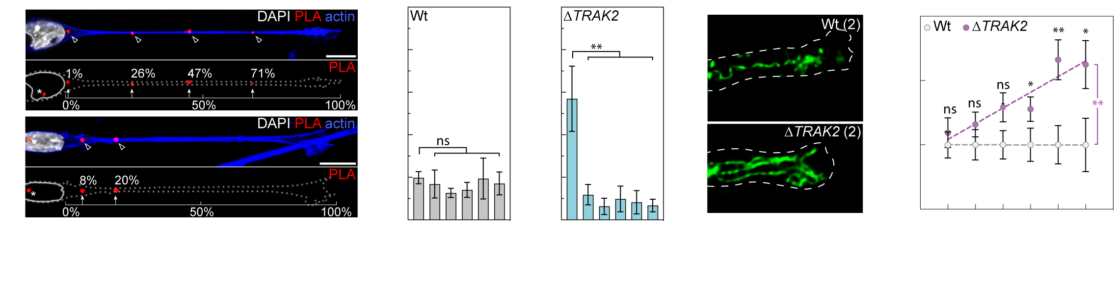 More recently, we’ve demonstrated that another one of these targeted mRNAs directs the cell-size-scaling of mitochondria distribution and function (Bradbury et. al., 2025. bioRxiv). We find that mRNA encoding TRAK2, a key determinant of mitochondria retrograde transport, is targeted to distal sites of cell protrusions in a cell-size-dependent manner. This cell-size-scaled mRNA polarisation in turn scales mitochondria distribution by defining the precise site of TRAK2-MIRO1 retrograde transport complex assembly (Fig.5a). As a result, excision of a 29bp 3’UTR motif that underpins this cell-size-scaling eradicates size-scaling of mitochondria positioning, triggering distal accumulation of mitochondria (Fig.5b) and progressive hypermotility as cells increase size. As such, we find an RNA-driven mechanistic basis for the cell-size-scaling of organelle distribution and function that is critical to homeostatic control of motile cell behaviour (Bradbury et. al., 2025. bioRxiv).